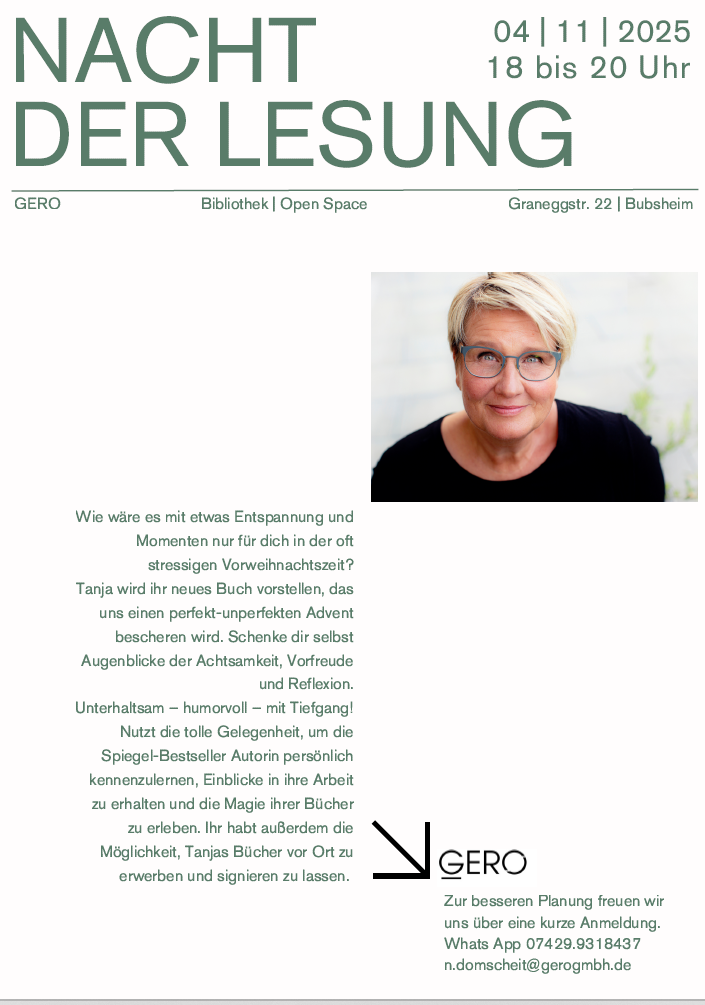 Die passende Antwort dazu hat die zweite Autorin des Abends: die Spiegel-Bestseller-Autorin Tanja Köhler. Die Rauhnächte-Bücher der Diplom-Psychologin zählen seit Erscheinen zu den absoluten Lieblingen der Rauhnächte-Fans und auch Einsteiger. Im gekonnten Wechselspiel mit Eli wird Tanja aus ihrem neuen Buch „Dein Advent – 24 Glücksmomente nur für dich“ die passenden Tipps zu heiklen Situationen für uns auswählen. Ihre Botschaft: Schenk dir selbst die allerschönste Advents- und Weihnachtszeit!